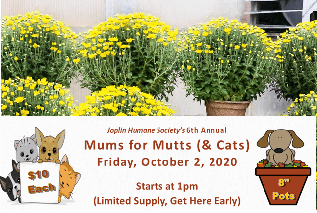 Help a great cause and decorate your porch for fall with colorful mums and helps support homeless pets in Joplin. These wonderful 8-inch pot mums will sell out quickly. We have complete details.